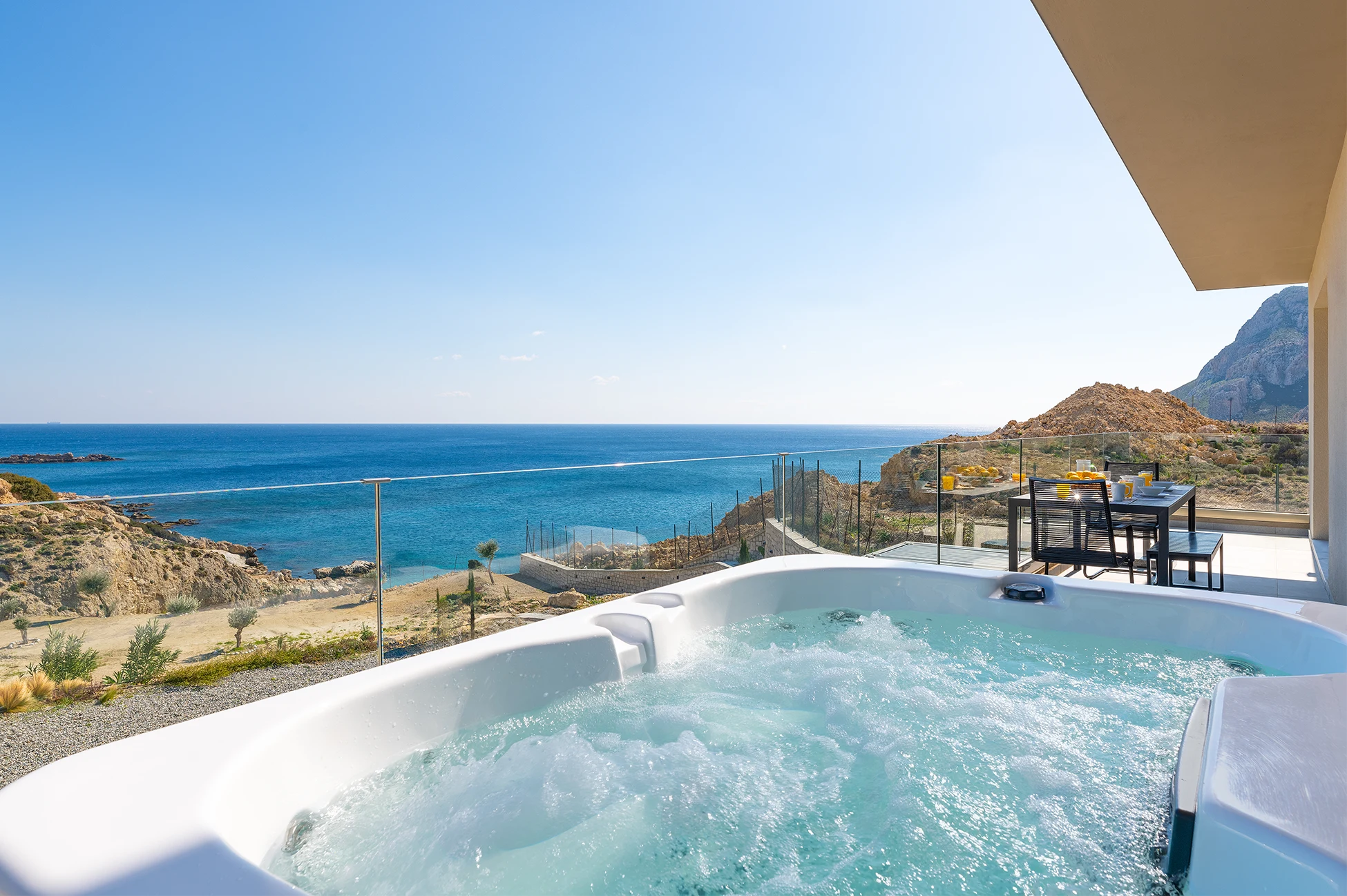 All of our suites feature a private, heated jacuzzi, offering the perfect setting to relax and unwind while enjoying the unique panoramic views of the Aegean Sea, gazing at the endless blue and the natural beauty surrounding our accommodations.