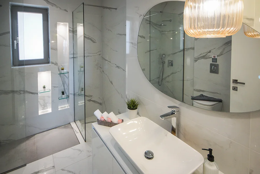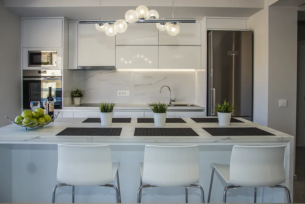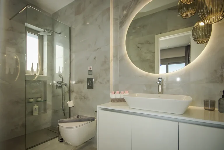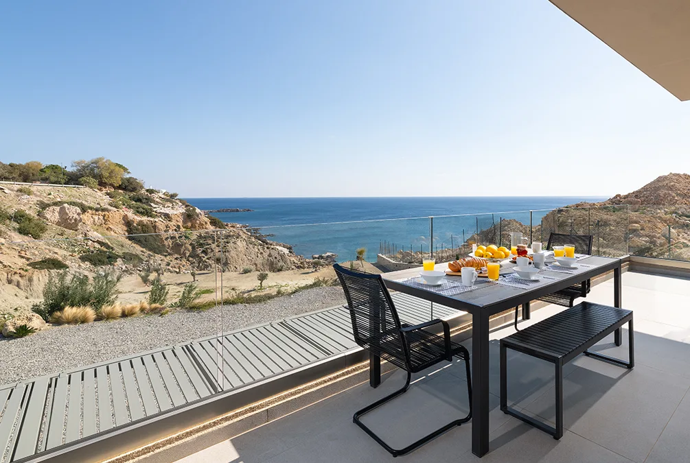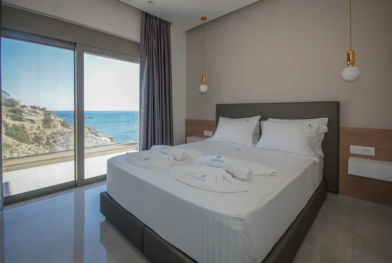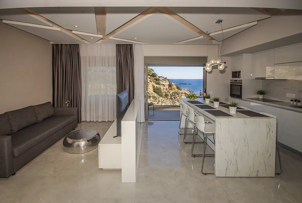 One of the bedrooms is a Master Bedroom with direct access to a fully equipped en-suite bathroom. The comfortable living and dining areas feature large panoramic windows that flood the space with natural light while offering breathtaking views of the sea and the endless blue horizon. The refined lighting and open layout create a sense of luxury and provide the perfect setting for romantic evenings.
