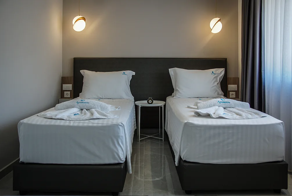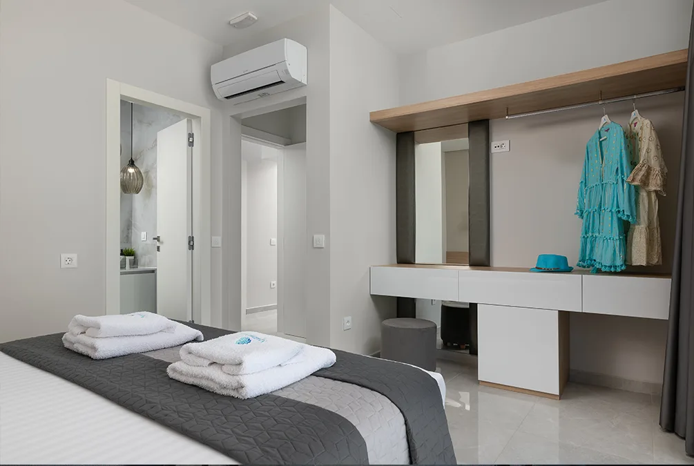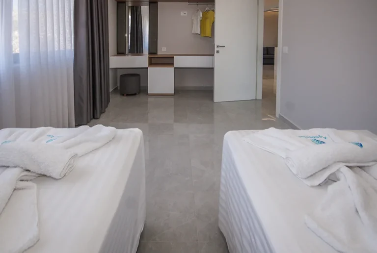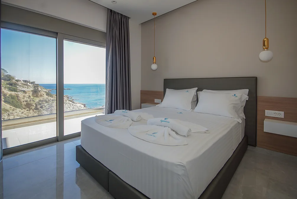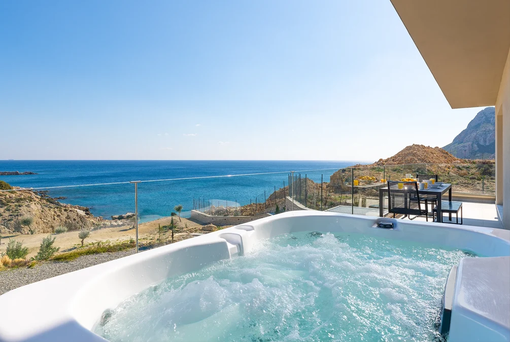 The standout feature of this suite is the private jacuzzi with panoramic views of the crystal-clear blue sea. Designed with modern elegance, this spacious suite can comfortably accommodate up to five guests and consists of one living room, two separate bedrooms, and two modern bathrooms with showers and complimentary toiletries.