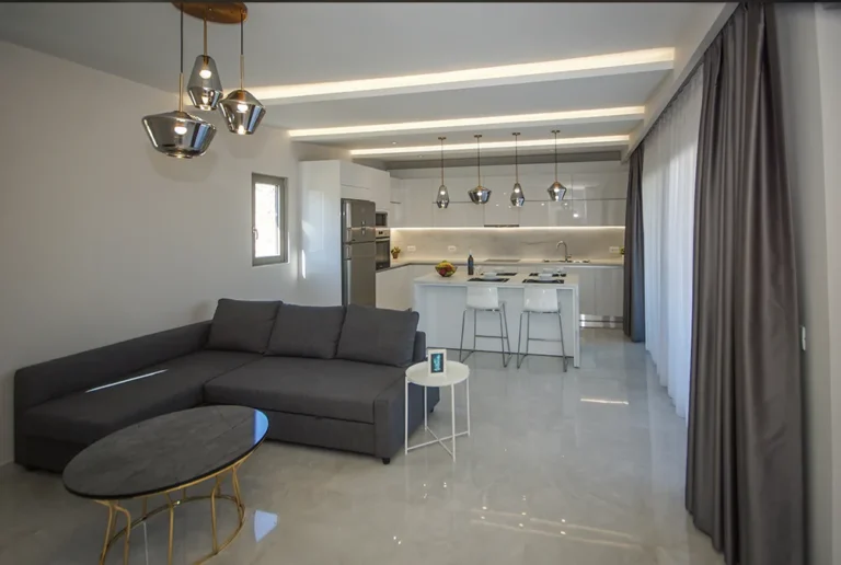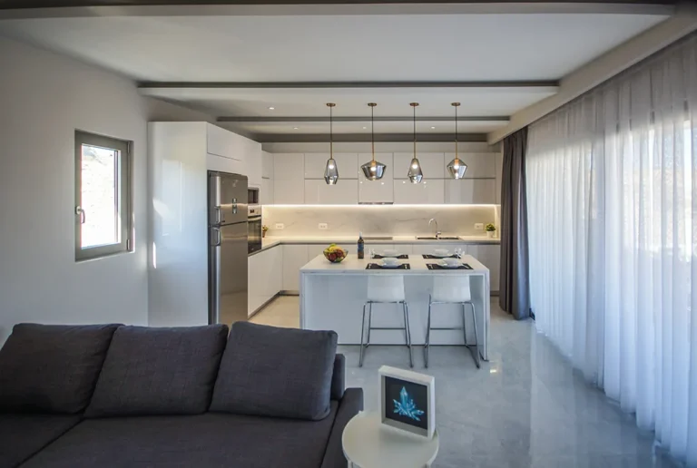 The large, modern, and fully equipped kitchen allows guests to prepare and enjoy private dinners with their loved ones. It includes a stovetop, refrigerator, oven, kitchenware, toaster, and a tea and coffee maker, ensuring a comfortable and enjoyable stay.