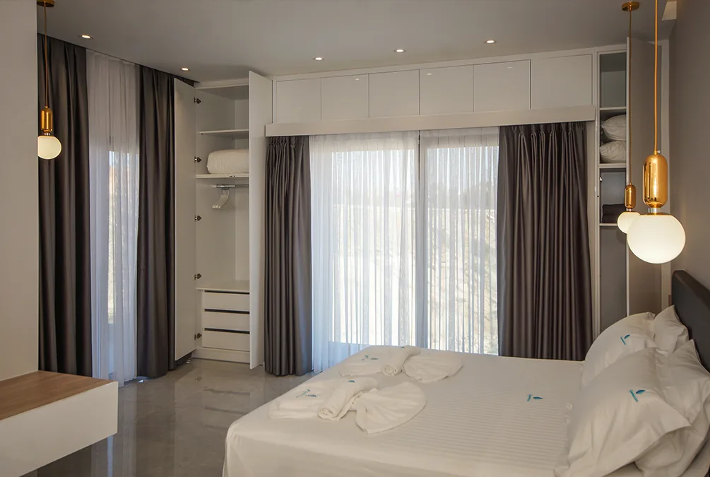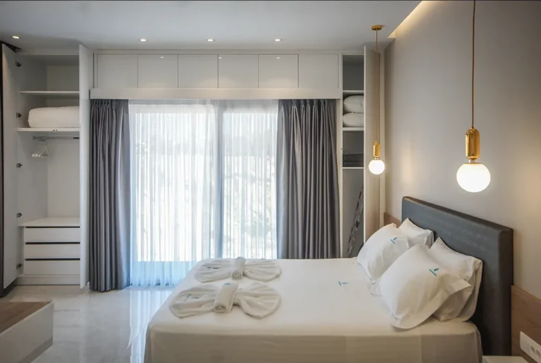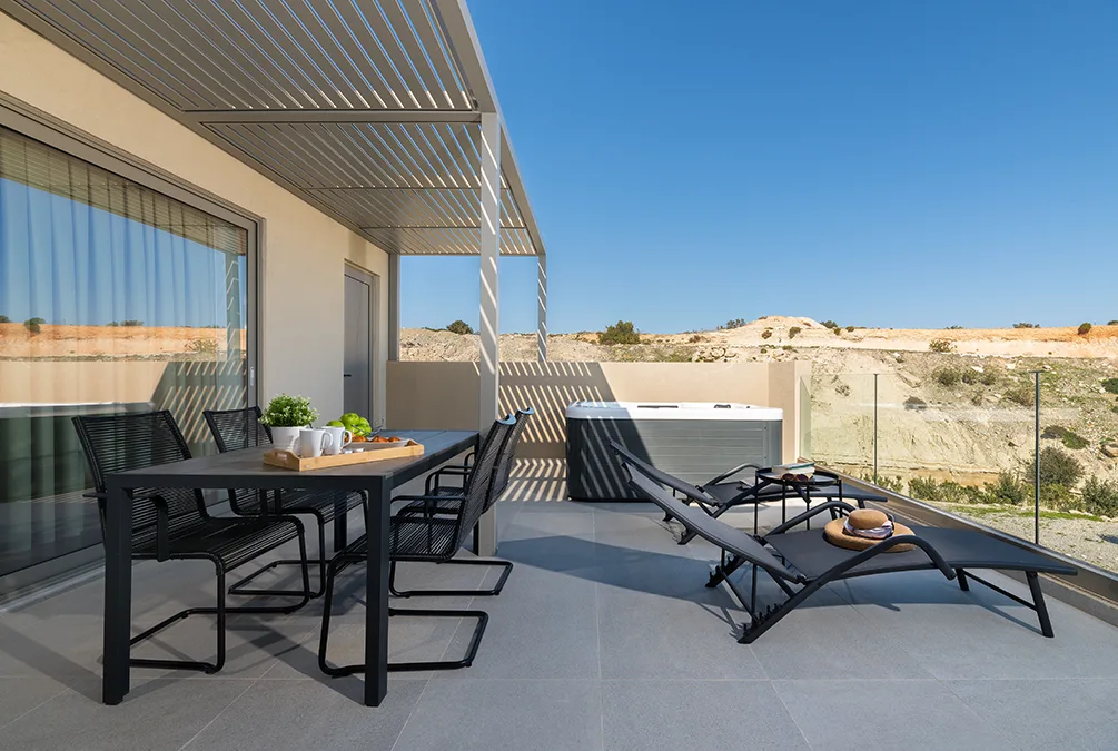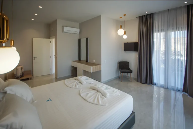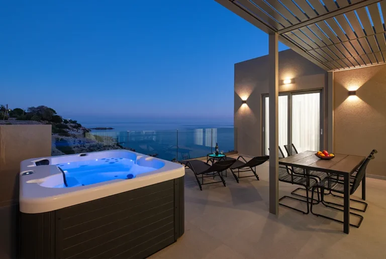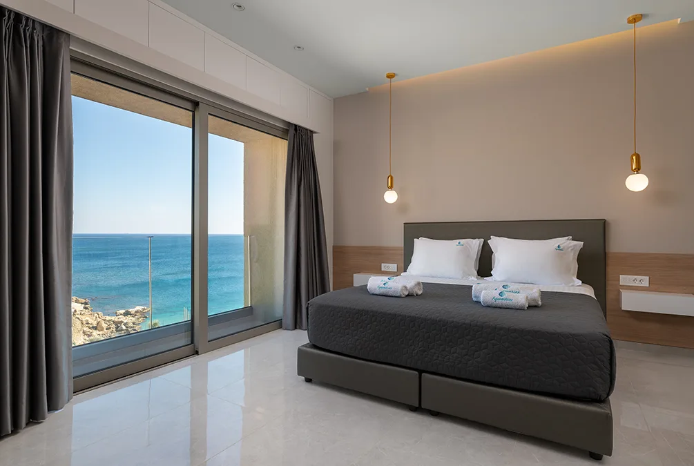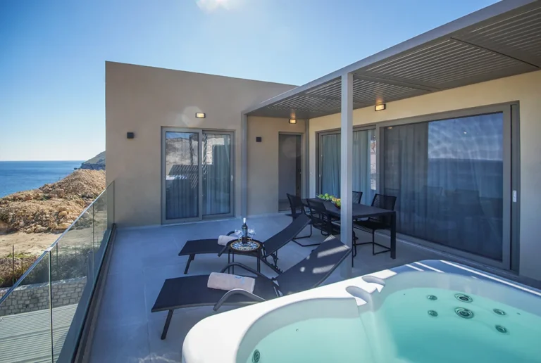One of the suite’s standout features is the private jacuzzi with panoramic sea views, offering the perfect setting for relaxation. Large windows allow abundant natural light while providing stunning views of the sea and the endless blue horizon.